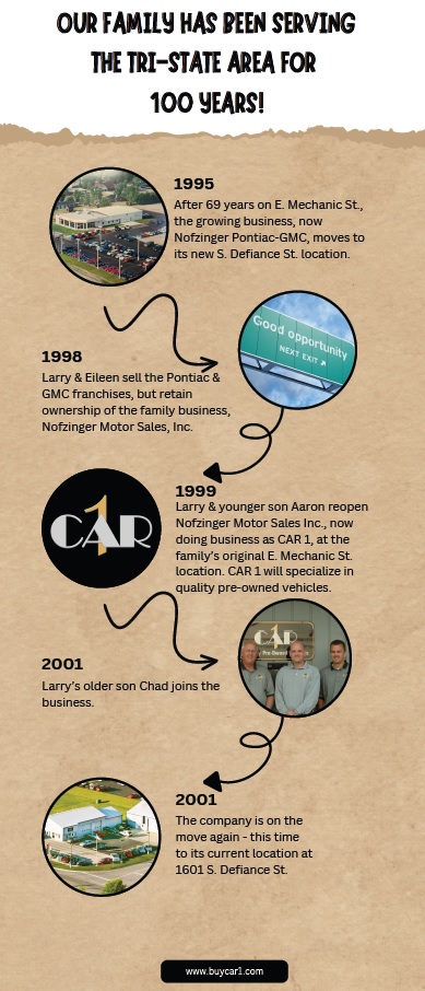 Before establishing CAR 1, Larry was the third generation owner and operator of Nofzinger Pontiac-GMC in Archbold, Ohio. After selling the new car franchise in 1998, Larry & Aaron recognized a need for a dealership that could provide quality, pre-owned vehicles to consumers in a hassle-free environment. CAR 1 is that dealership.